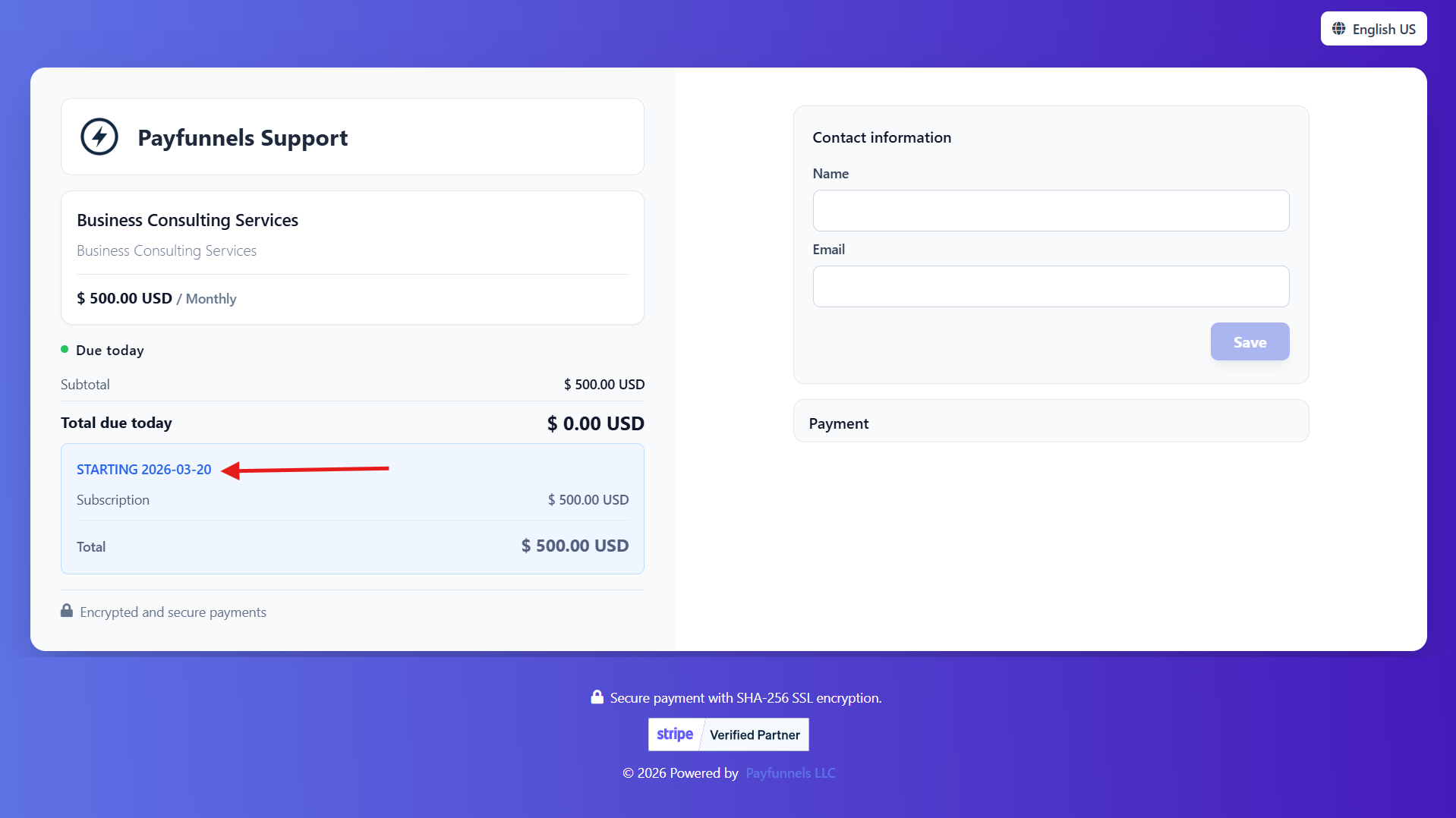 - Save the payment link and share it. Your clients can also see the billing date on the checkout page as shown in the screenshot below: