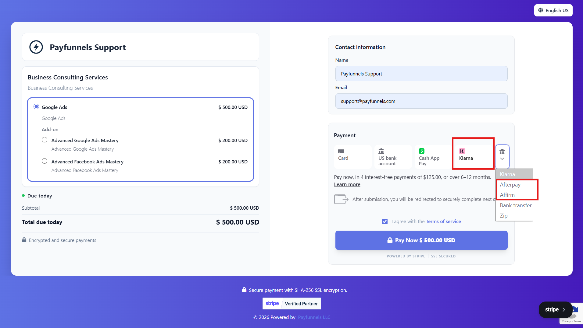 - Once you enable AfterPay from the Settings under the Billing section, your customers will see that option while paying the invoice. Below is the screenshot.