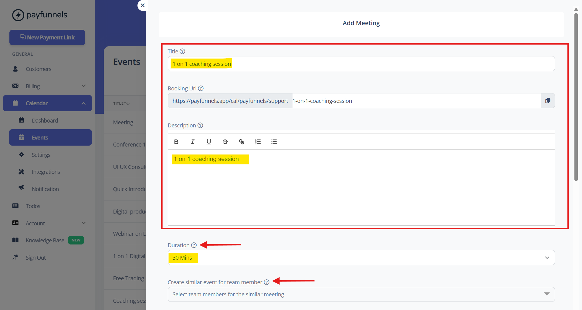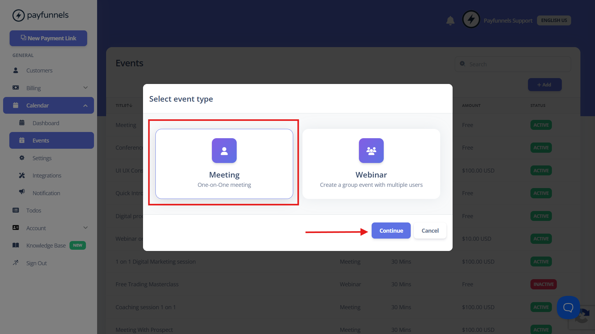 You can now create Events(Free or Paid) like meetings and webinars in Payfunnels. Below are the steps: