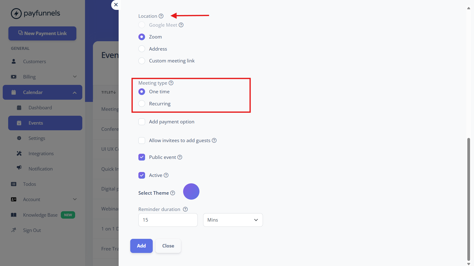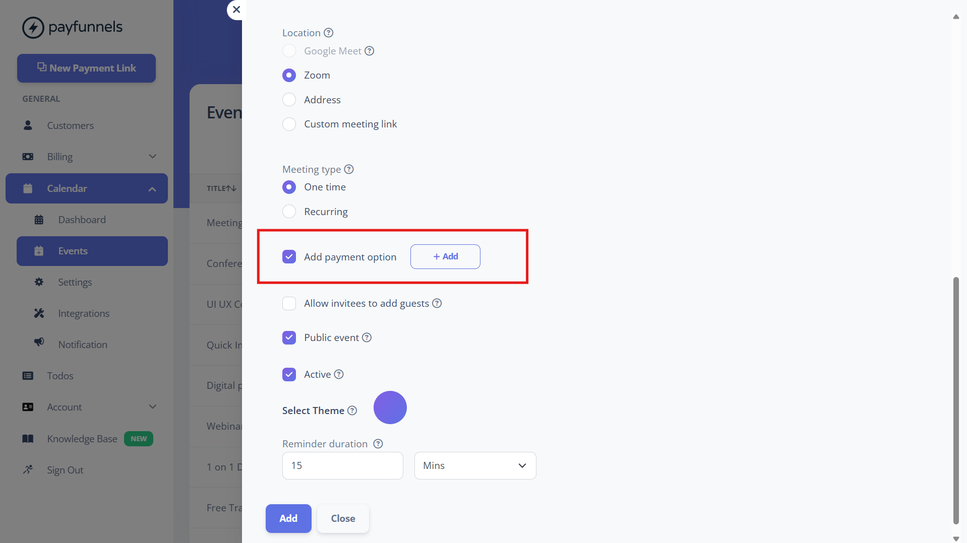 - Select the ✅ Add Payment Option if you want to make this event chargeable. You can add One-time and Recurring Payments and Payment Plans as well.