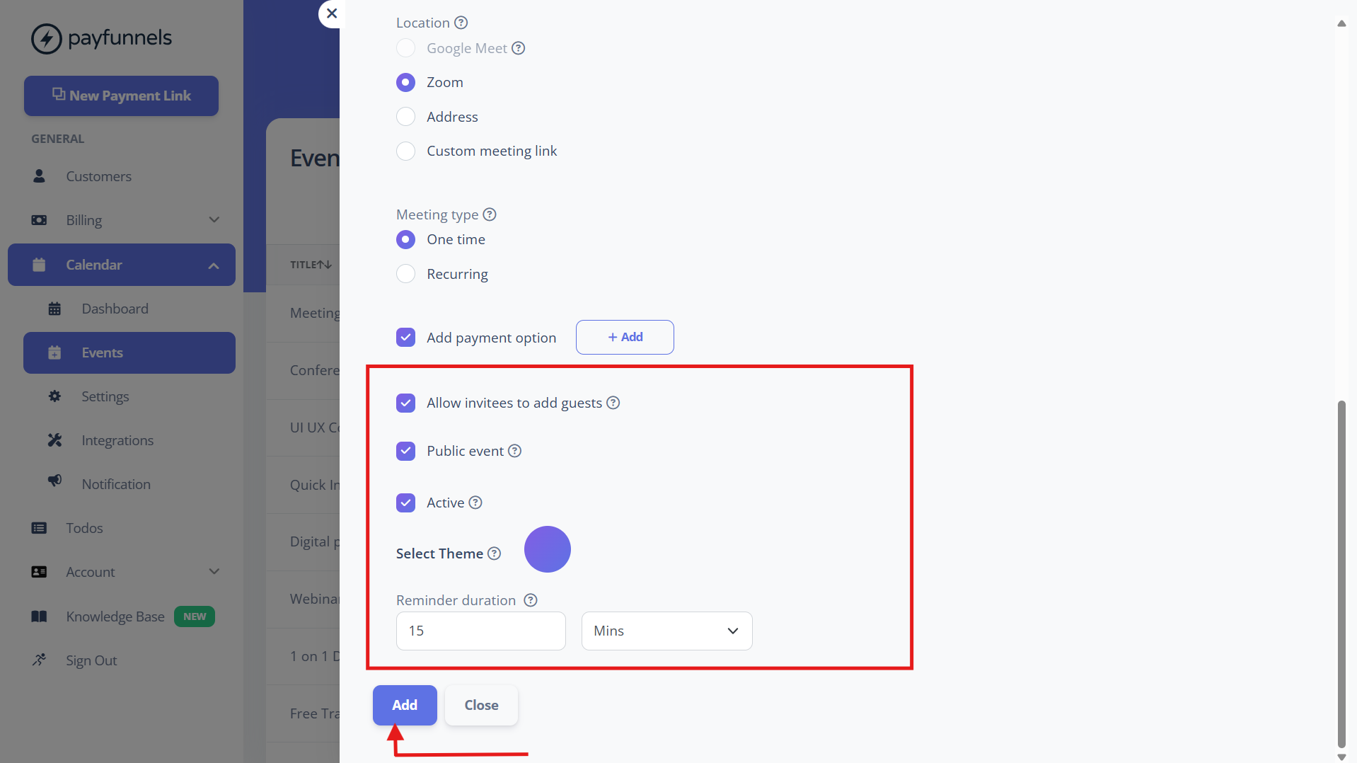 - In the end, set 'Reminder duration' to remind participants about this event/webinar. Now click on the 'Add' button to save this event.