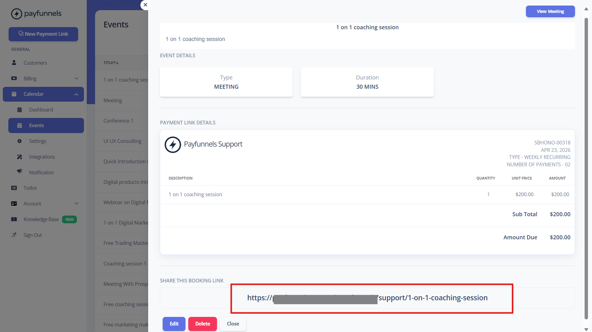 - After saving the event, you will see that the booking link is generated. You can send this link to your customers, they can easily register and book a slot in your calendar. Below is the screenshot.