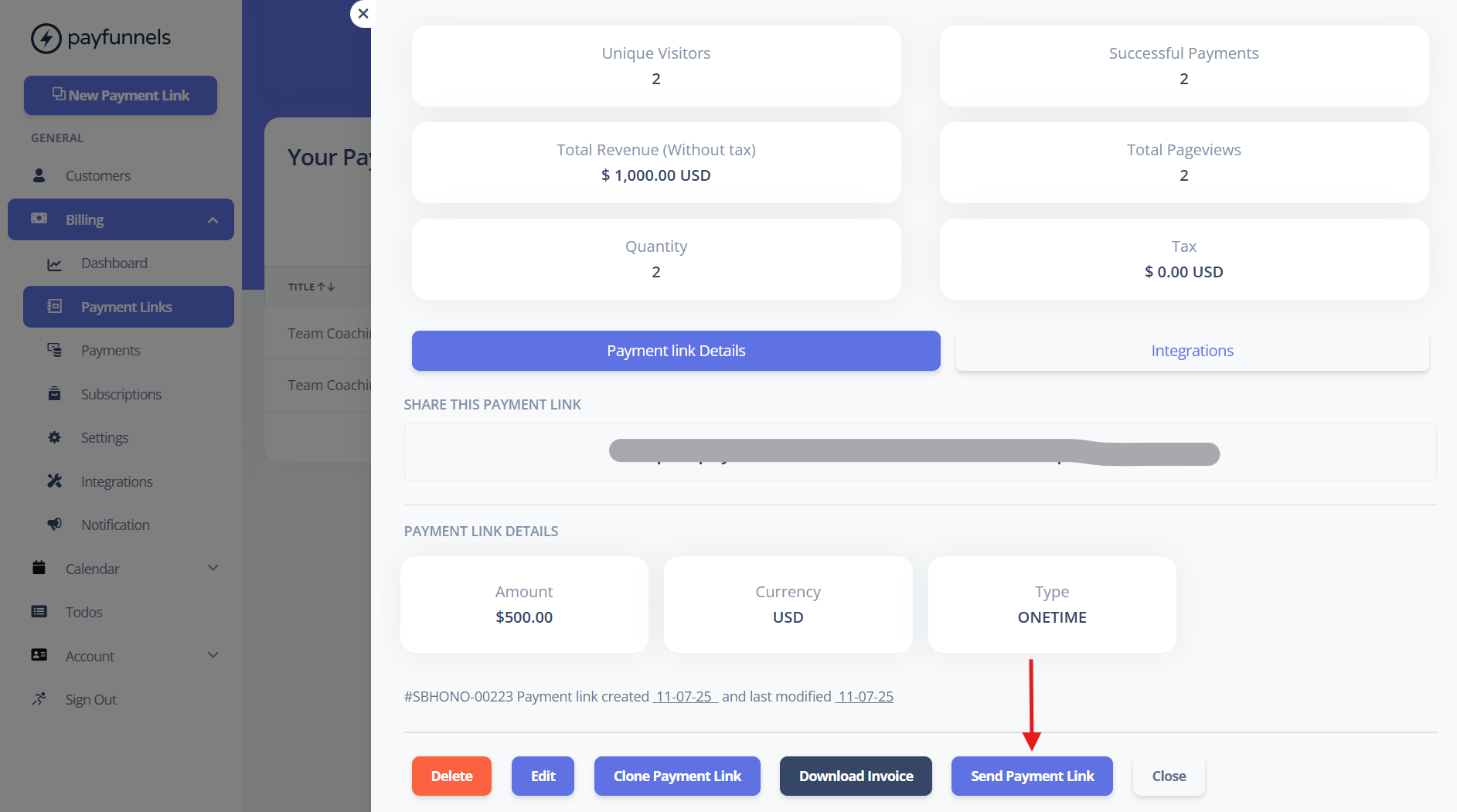 - Please open the Payment Link you want to send your customer and scroll to the bottom and, you will see the 'Send Payment Link' button. Below is the screenshot.
