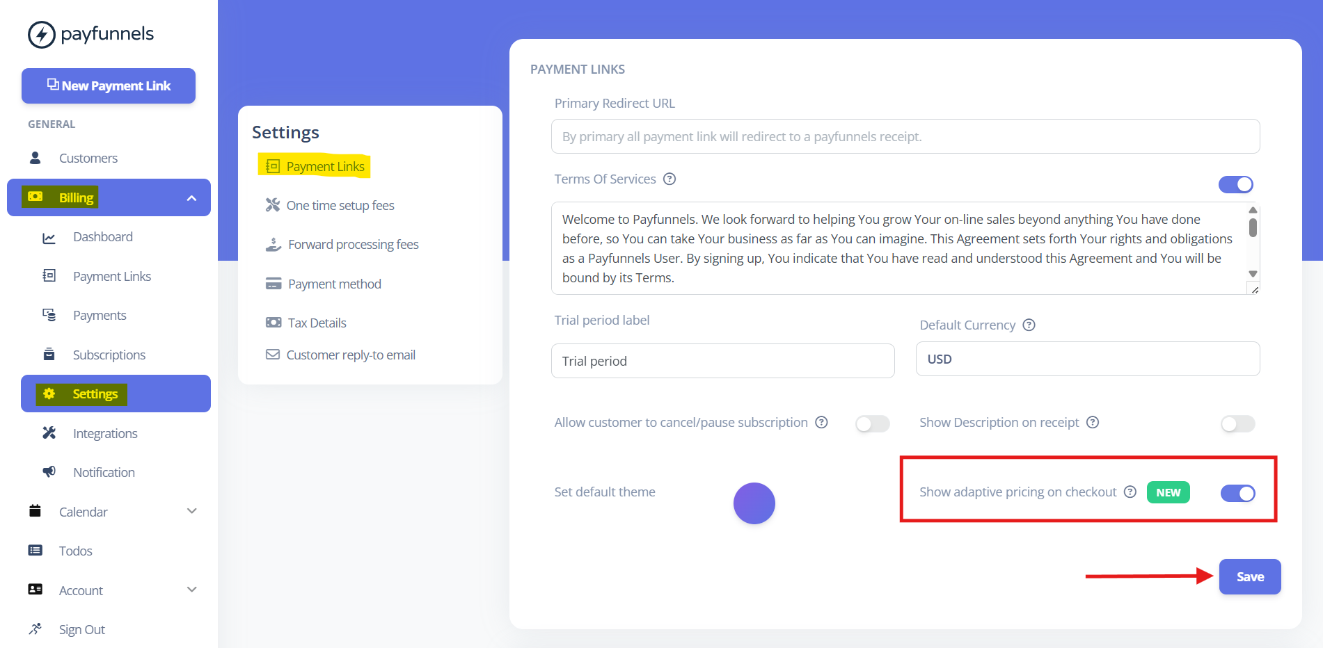 - To enable 'Adaptive Pricing', go to Settings under the Billing tab, and you will see an option. Simply toggle and click on the save button and that's it. Below is the screenshot.