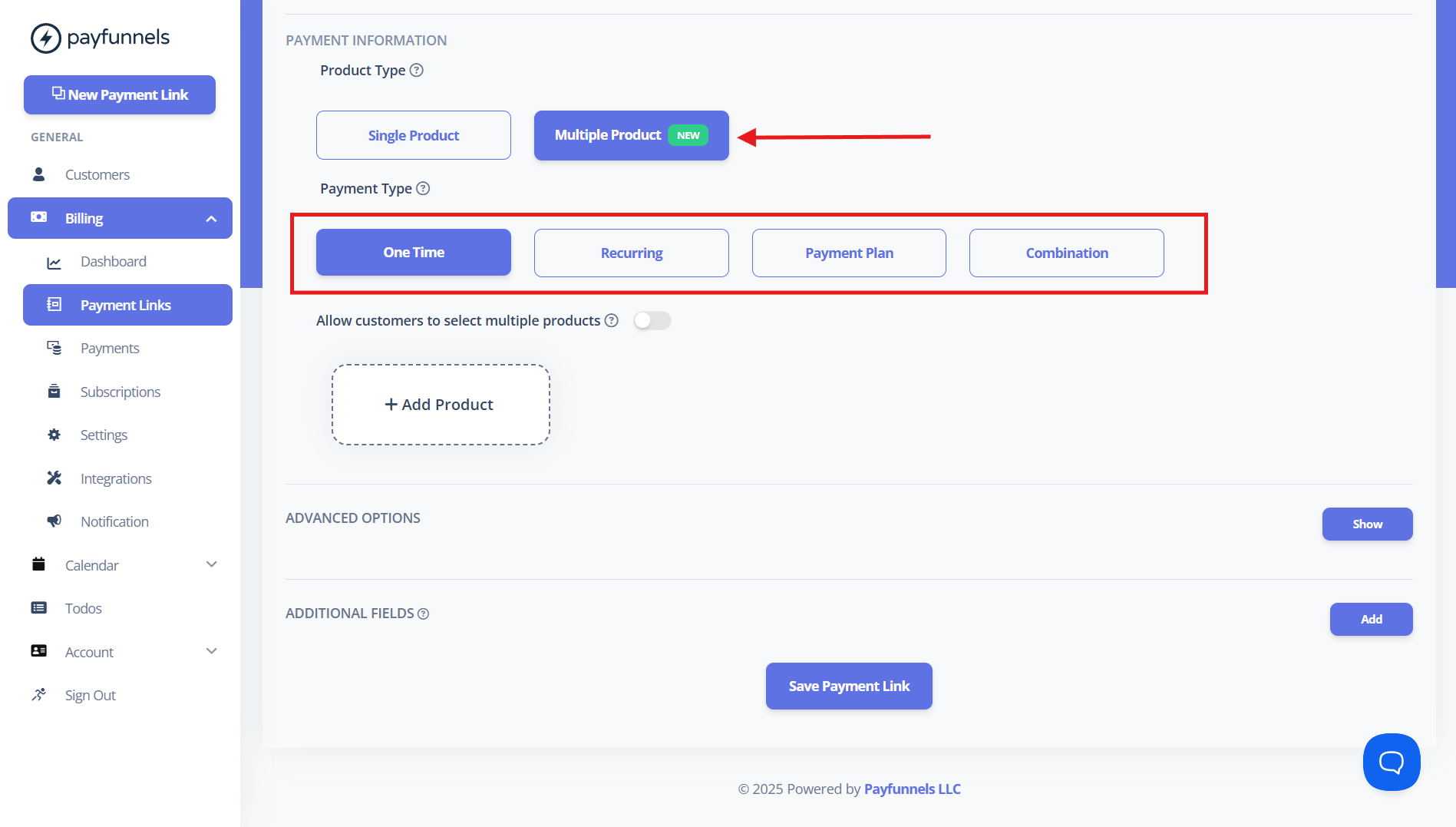 - To get started, click on New Payment Link, select the Multiple Products option, and then choose Payment Link Type, One-Time, Recurring, or Payment Plan. (See the screenshot below.)