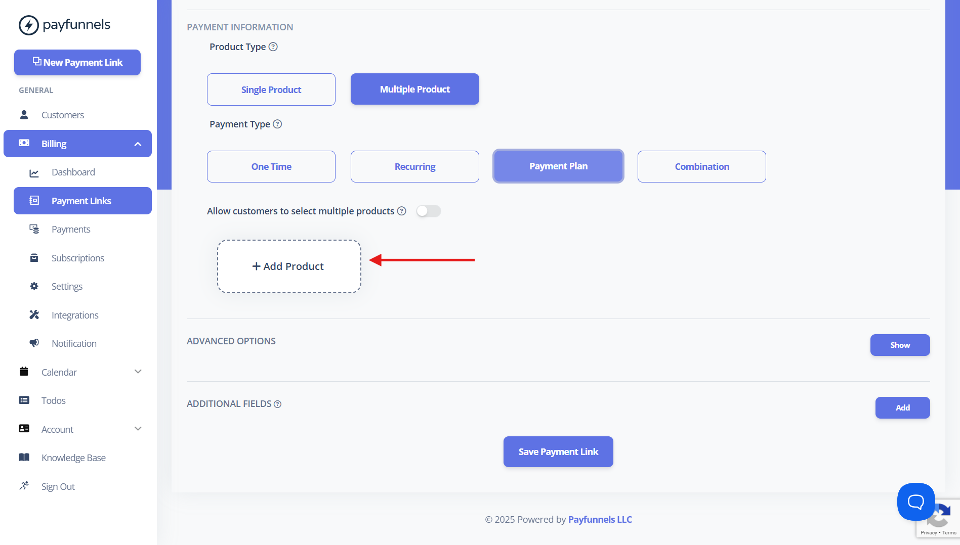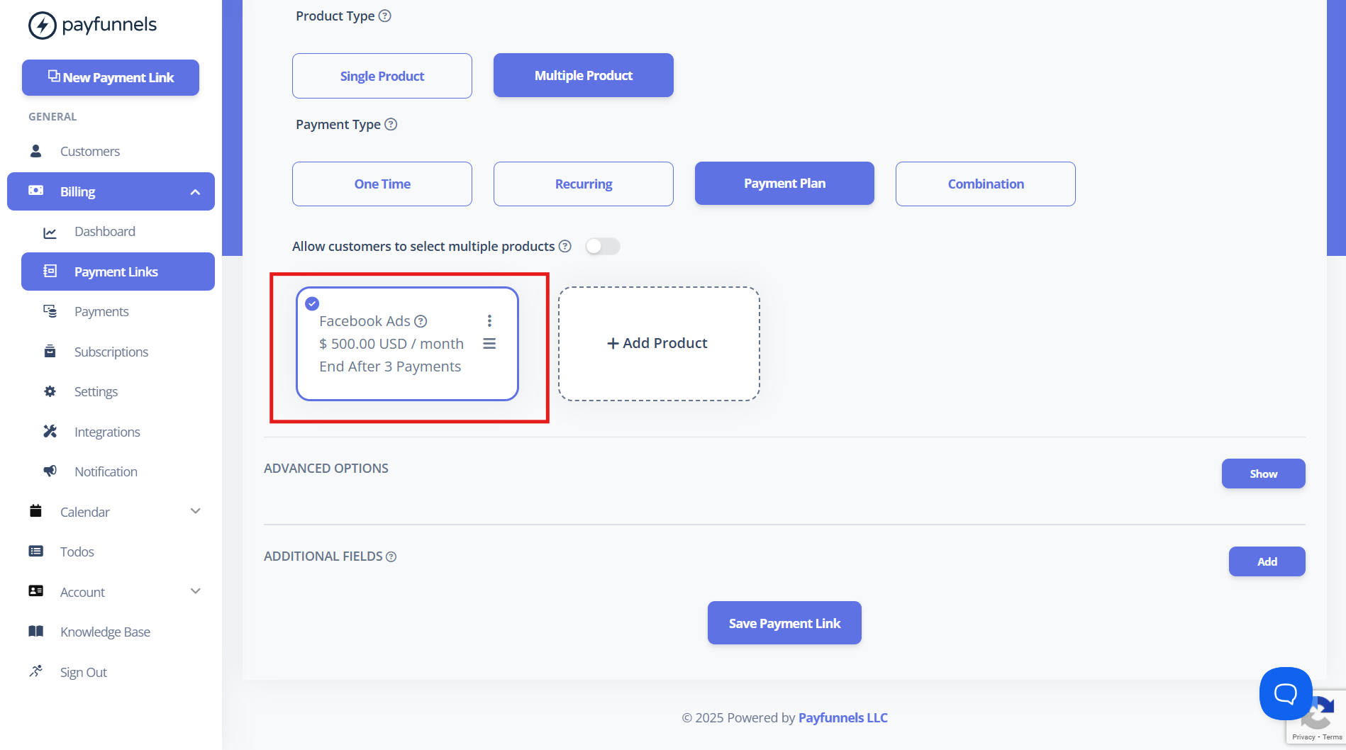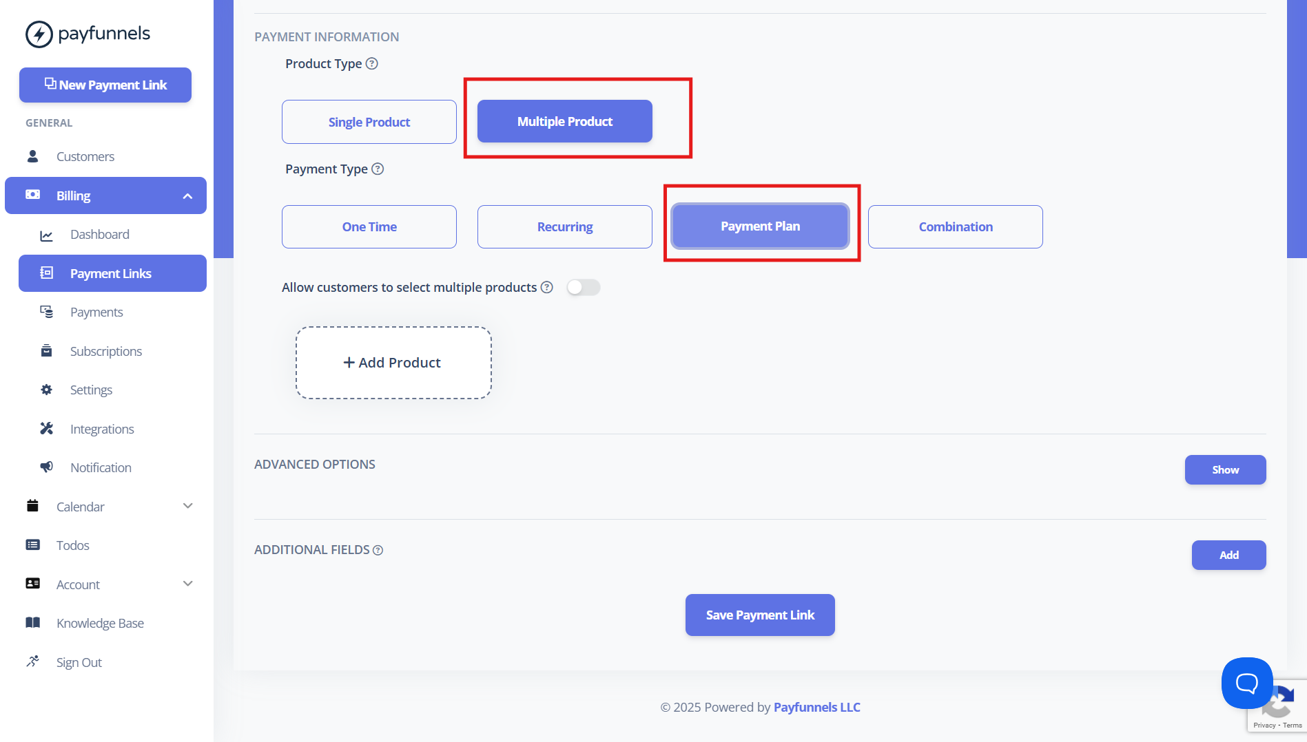 - Log in to your Payfunnels account and click on New Payment Link. Enter the product or service name and description. Select the Multiple Products option and choose Payment plan under Payment Types. See the screenshot below for reference.
