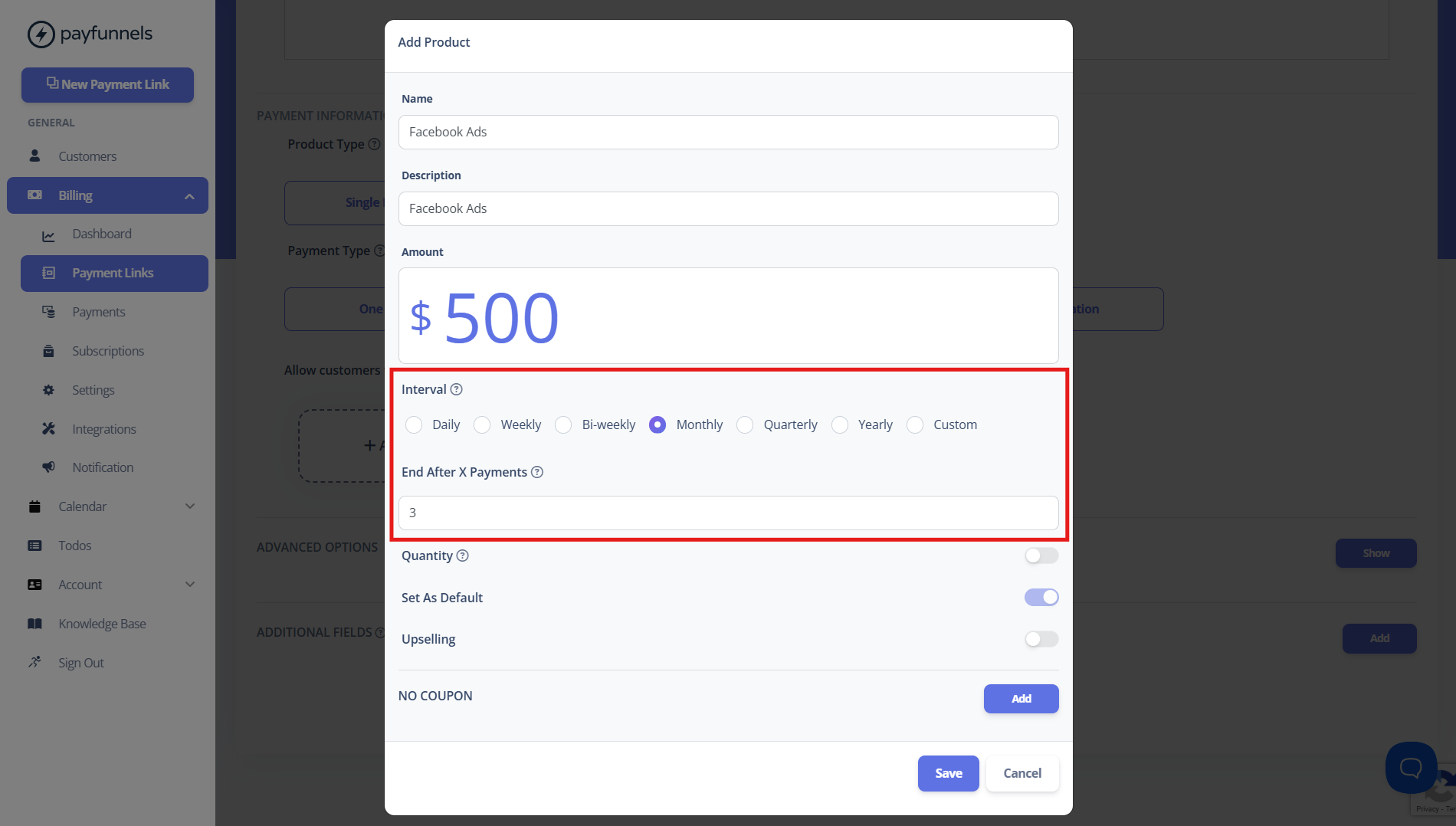 - In this example, let's choose Monthly as the payment interval and 3 payment in 'End After X Payments'. It means, the subscription will automatically end after 3 payments.