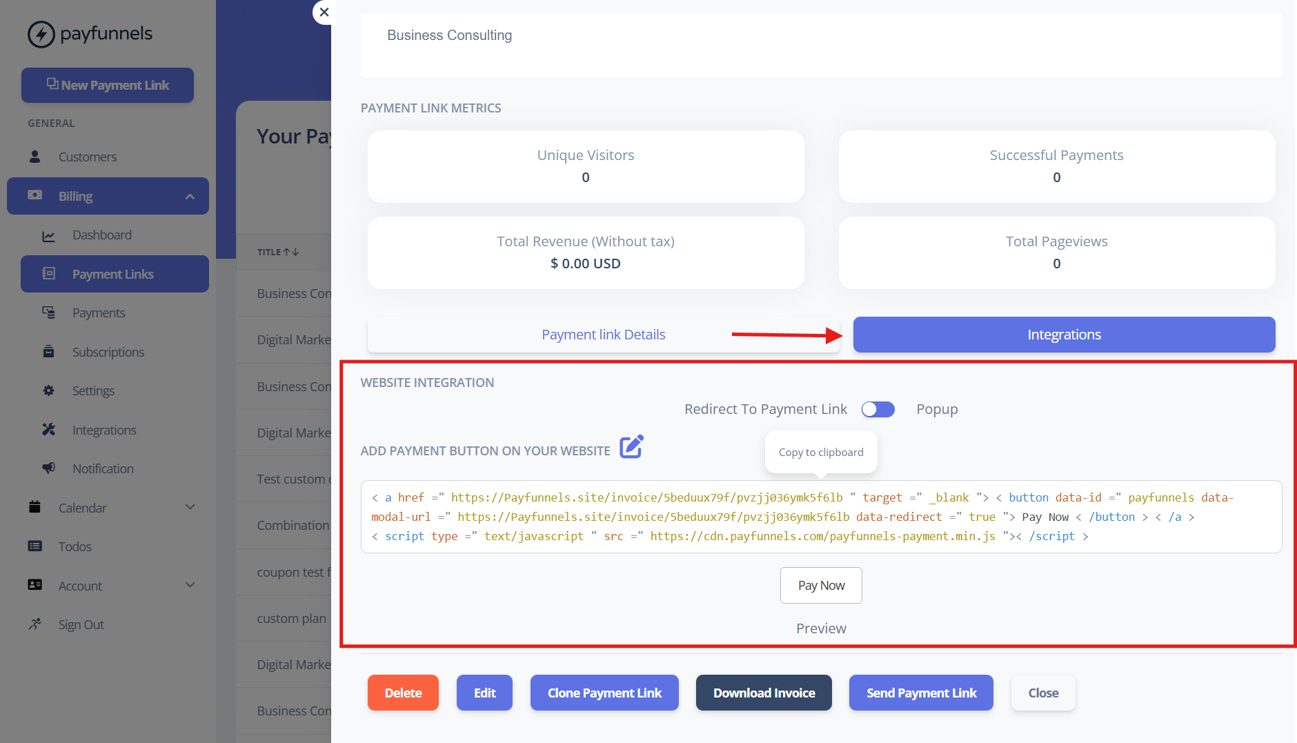 - From the Integrations section, you can add this payment link as a "Pay Now" button on your website to easily collect payments.