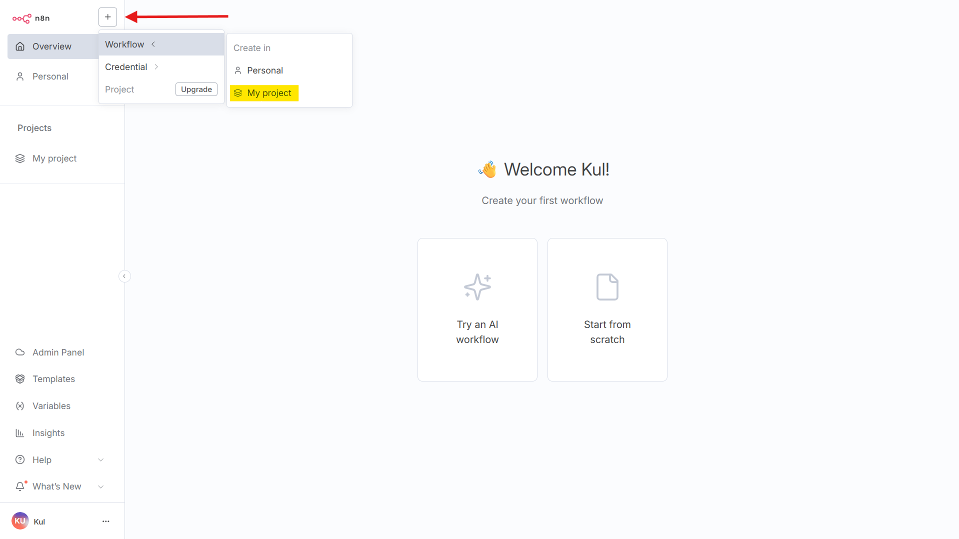 - Select the workflow location where you want to create it. Choose Personal if you want to create it separately, or select a Project if you want it under an existing project. For this example, let’s select My Project. (See screenshot below)