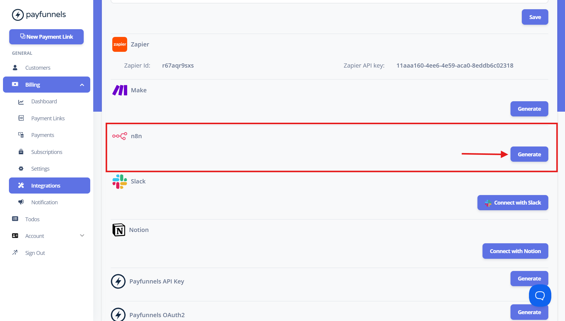 - Click on the Generate button, then copy and paste the credentials into your n8n account.