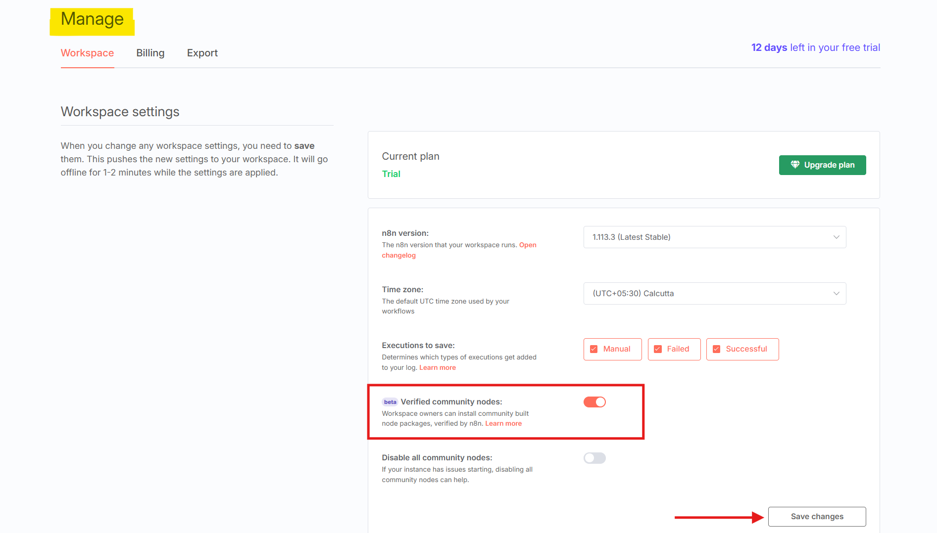 - First, log in to your n8n account and head to the Admin Panel -> Manage -> Workspace and enable Verified community nodes toggle.