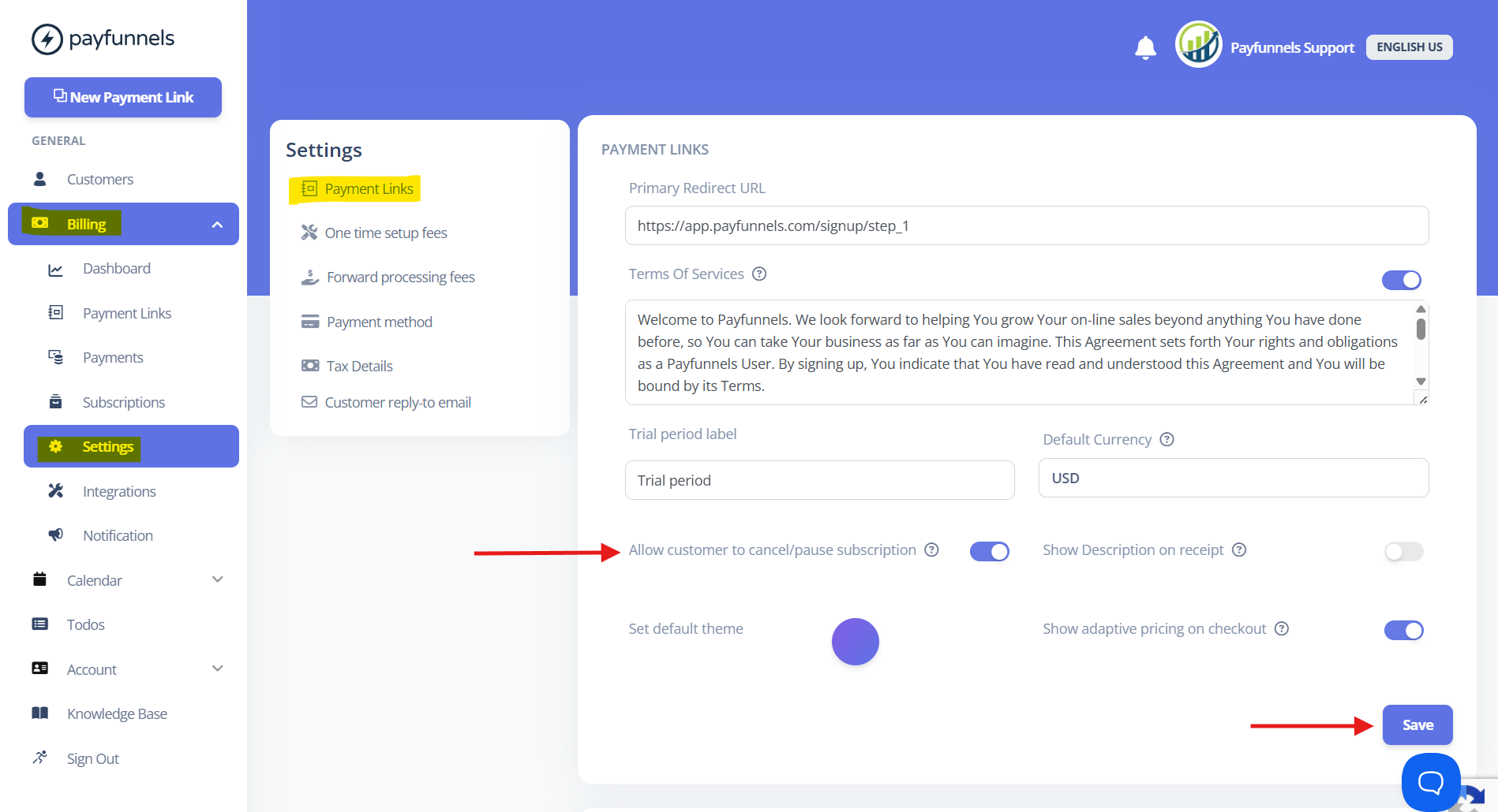 - To enable this option by default for all new payment links, you can turn it on from Settings under the Billing section. Please click on the Save button after changing any settings. Refer to the screenshot below.