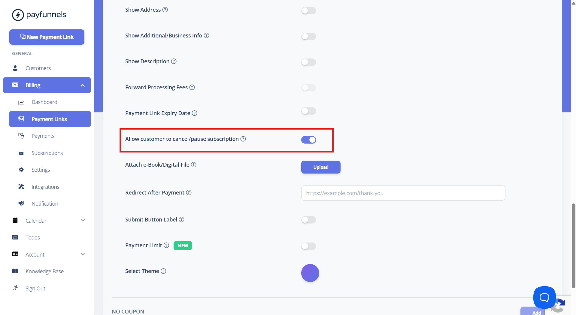 - To share subscription access with customers, go to Advanced Options while creating or updating the payment link and enable Allow customer to cancel/pause subscription toggle. Refer to the screenshot below for guidance.