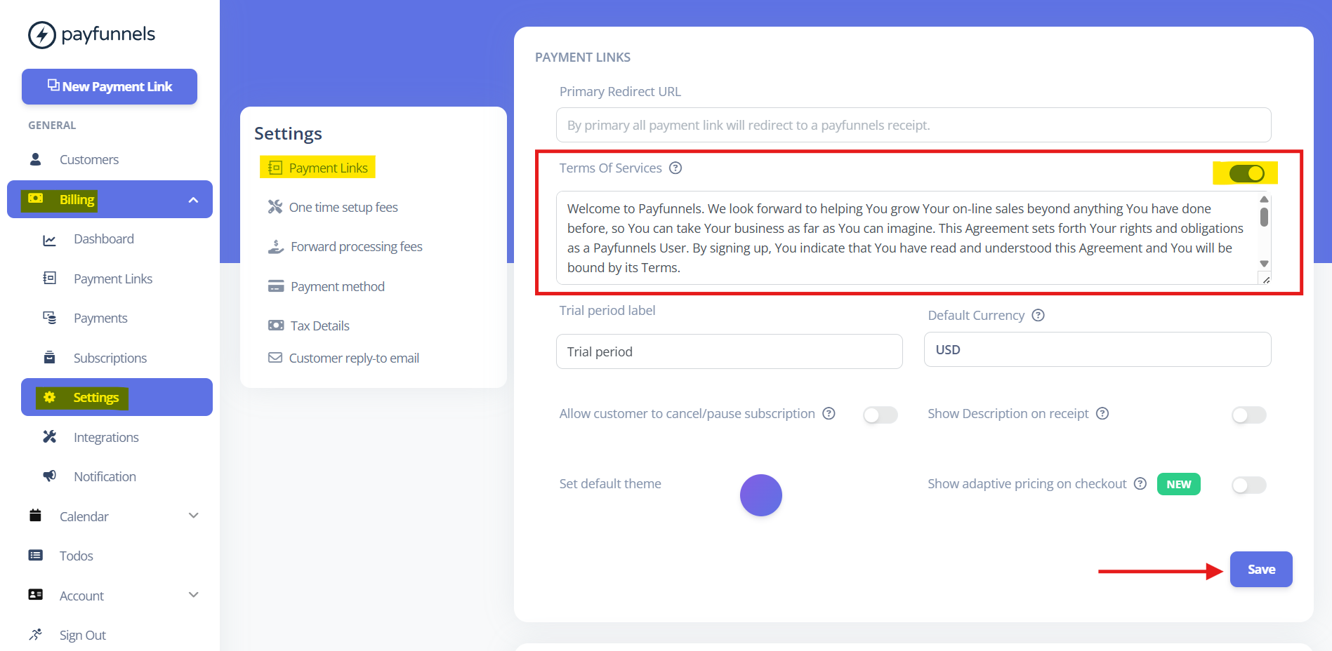 - Then go to the 'Payment Links' section, look for the 'Terms of Service', and add the information. Save once you're done.