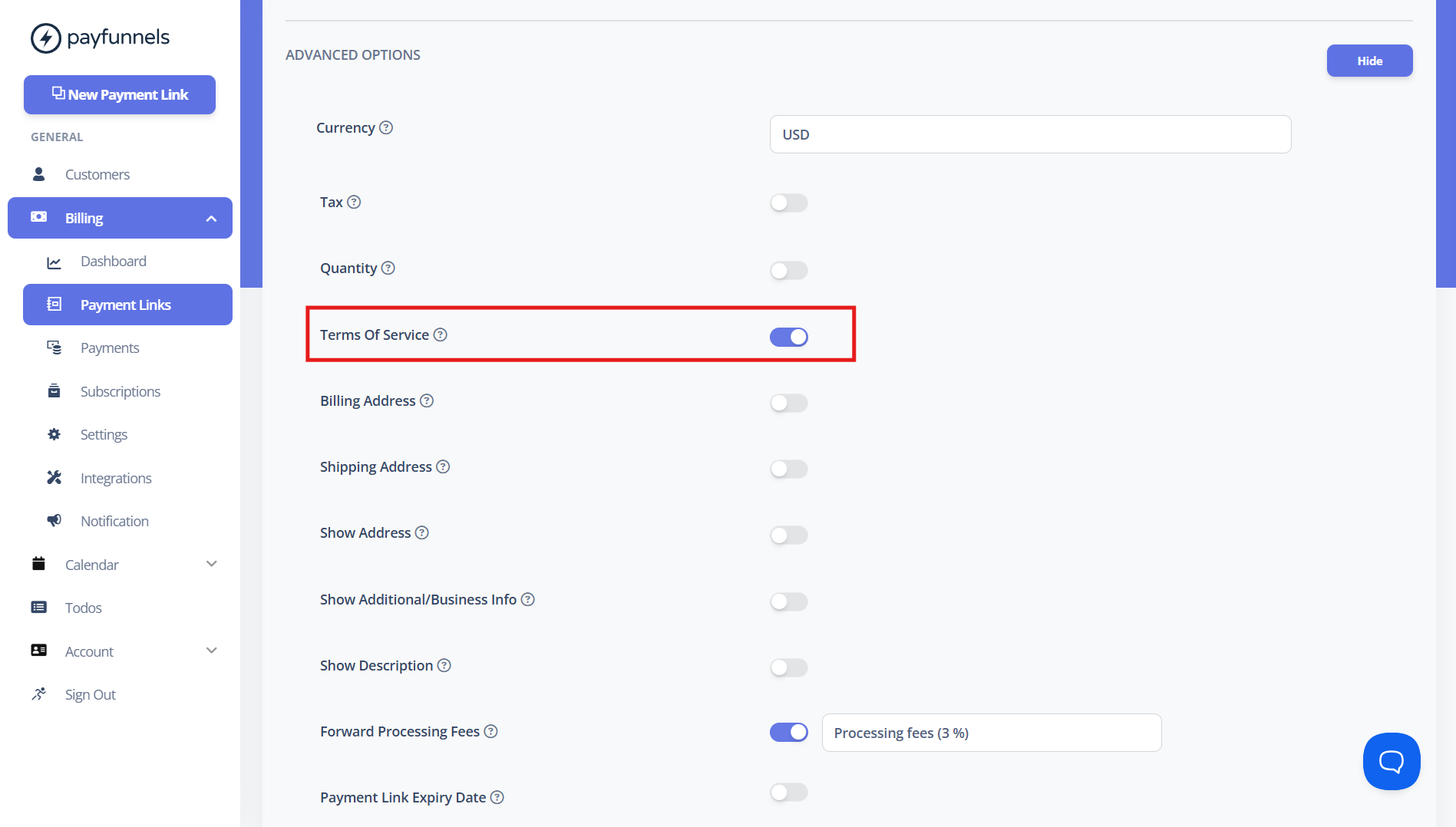 Below are the steps on how to add and enable Terms of Service in the Payment Link:
