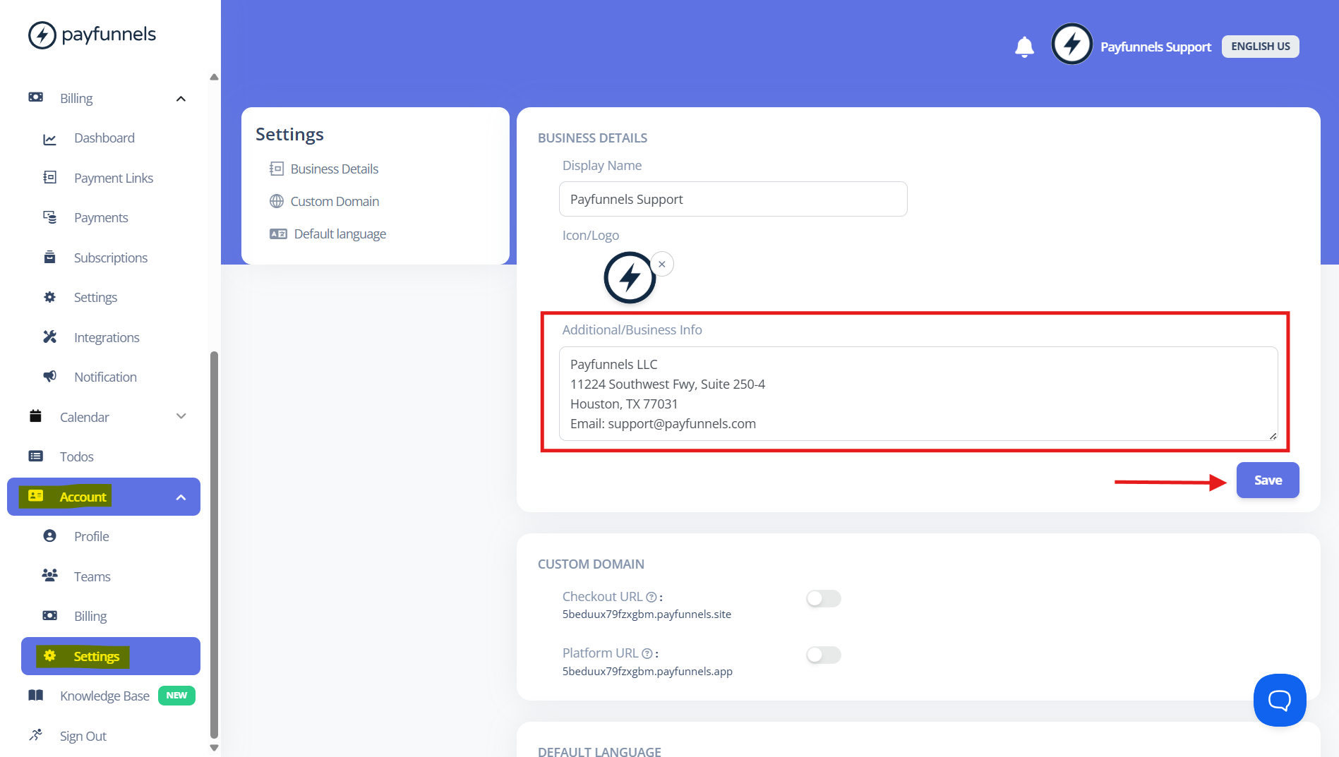 - To enable Company information/Additional info on your client's payment receipt, you have to go into the Setting section under the Billing tab, enter information in the Additional Info area as you can see in the below screenshot, and save it.