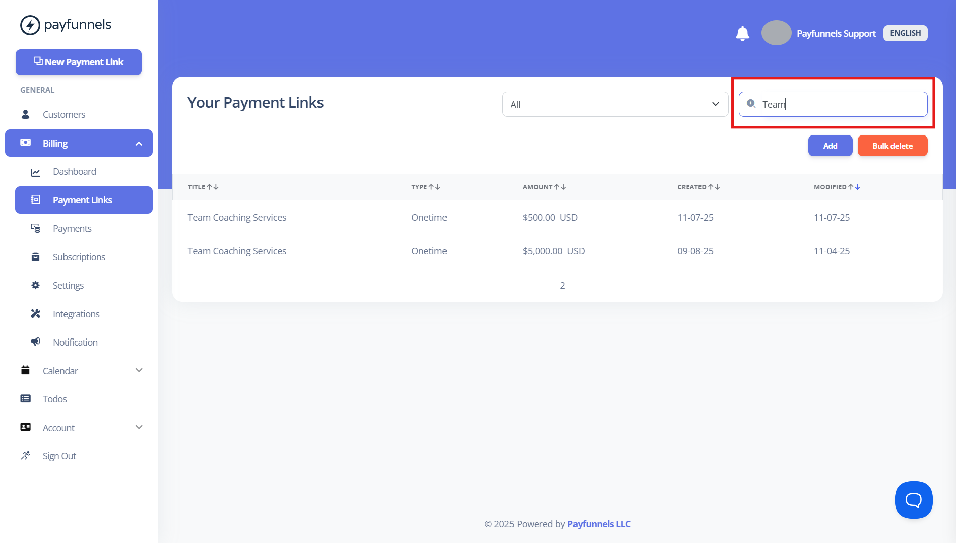 - Please Login to your Payfunnels account, then go to the search bar to find a particular payment link from your list. Below is the screenshot.