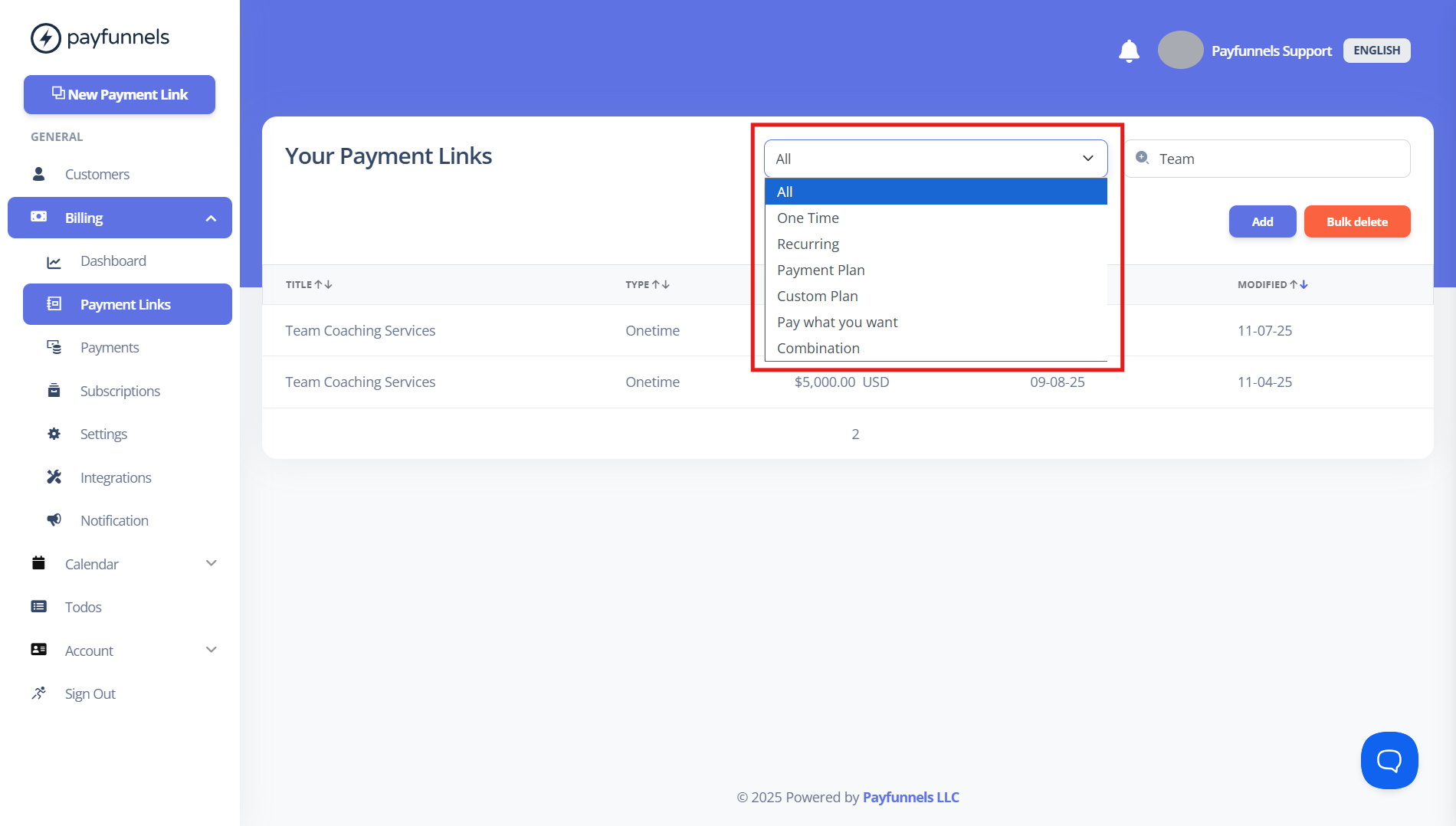 - Now, you can also check and find payment links using it's types beside the search bar. See the below screenshot.