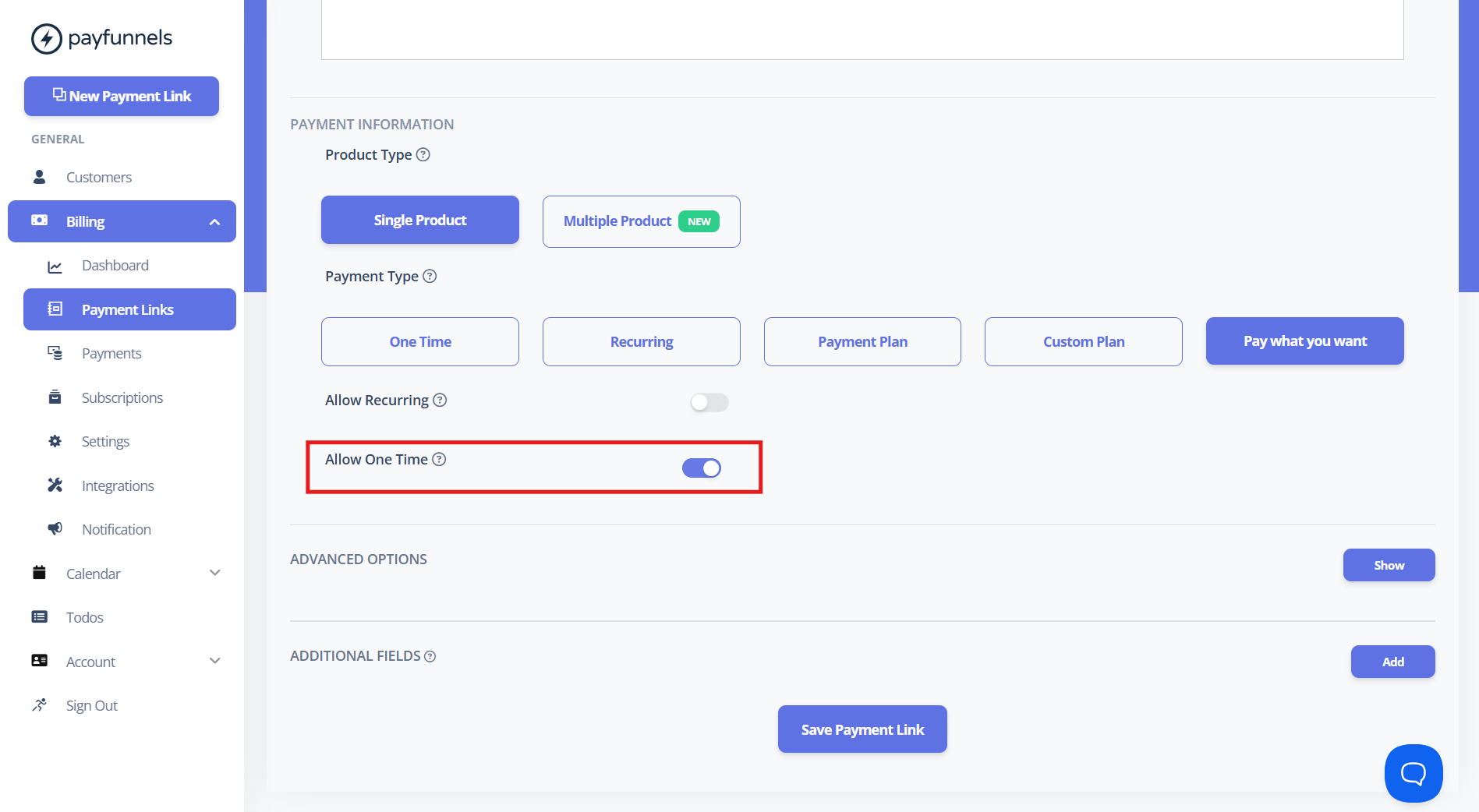 If you want to create a one-time payment link then please go into the advanced option and select enable the 'Allow One-time' toggle as shown in the attached screenshot and it will allow your client to make only a single payment.